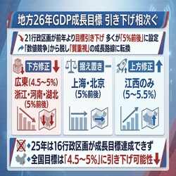 多くの行政区画が成長目標を引き下げたことを受け、全国の目標も引き下げられる可能性があるとブルームバーグ通信は報じている。3月5日に開幕する全国人民代表大会(全人代、国会に相当)で発表される成長目標は「4.5~5%」になるとの見通しを示した(25年は「5%前後」)。