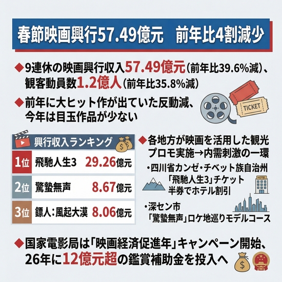 前年の春節連休は、国産アニメ映画「ナタ之魔童閙海(邦題:ナタ 魔童の大暴れ)」が歴史的な興行成績を記録するなど、映画市況が活況となっていた反動が出た。今年は目玉となる作品が少なかったことが興行不振の一因とみられている。