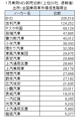 メーカー別の1月卸売台数は、比亜迪(BYD:1211/HK)が20万5518台で圧倒的な首位の座を維持した。2~10位には、吉利汽車の12万4252台、テスラ中国の6万9129台、奇瑞汽車(9973/HK)の4万7895台、賽力斯の4万12台、小米の3万9000台強、零ホウの3万2059台、東風汽車の2万9975台、重慶長安汽車(200625/SZ)の2万9868台、上汽通用五菱の2万8661台が並んだ。