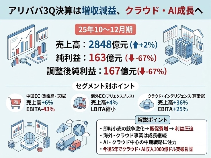 一方、海外EC事業の国際数字商業集団(インターナショナル・デジタル・コマース・グループ)は4%増収、LBITA(利払い・税引き・一部償却前損失)が縮小。越境EC「即売通(アリエクスプレス)」の運営効率が上昇した。また、阿里雲(アリババクラウド)を含む雲智能集団(クラウド・インテリジェンス・グループ)は36%増収、EBITAが25%増。人工知能(AI)関連製品の採用が拡大するなか、パブリッククラウド事業の売上高が増加している。うちAI関連製品の売上高は10四半期連続で3ケタの伸びを示した。