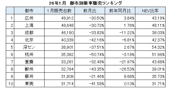 中国:1月の新車販売市場、広州・上海・成都が全国トップ